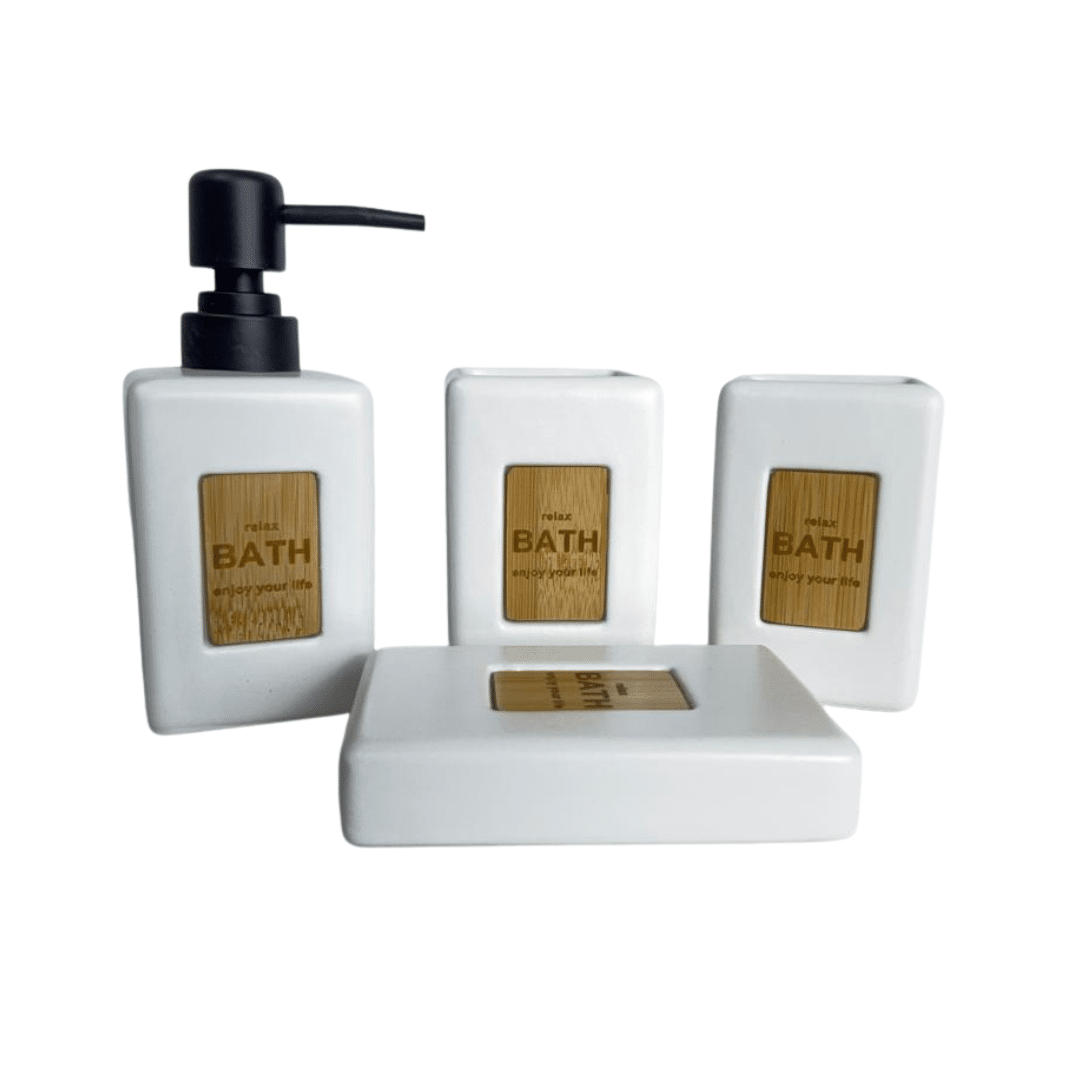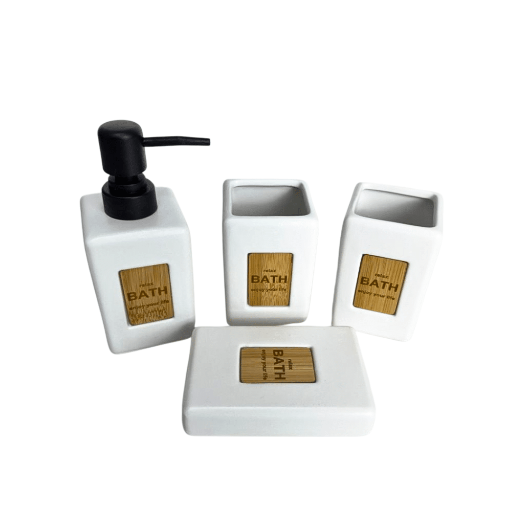 - مجموعة حمام كاملة: تتضمن 4 قطع أساسية: موزع الصابون، كوب، حامل فرشاة الأسنان، وطبق الصابون للحصول على مظهر حمام منسق.