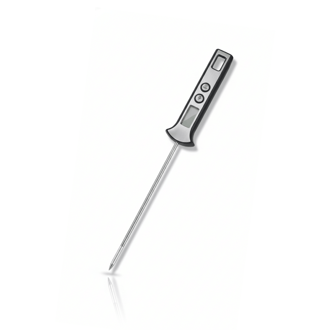 - مسبار طويل من الفولاذ المقاوم للصدأ بطول 23 سم – مسبار من الفولاذ المقاوم للصدأ مناسب للطعام يحافظ على اليدين بعيدًا عن الحرارة ويضمن فحوصات دقيقة وعميقة لدرجة الحرارة.
