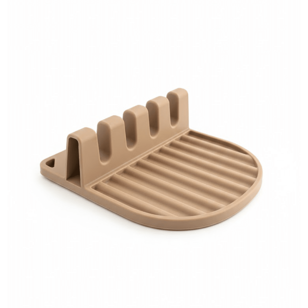 هذا الحامل السيليكوني لأدوات المطبخ يجمع بين قاعدة مخصّصة لراحة الملاعق وصينية تقطير مضلعة مع أربع فتحات عمودية لترتيب الملاعق، المغارف، الملاعق المسطحة وأدوات الطهي الأخرى بجانب الموقد. تحافظ الحواف المرتفعة والقاع المضلّع على تنقيط السوائل داخل الصينية بدلًا من وصولها إلى سطح العمل، بينما يساعد الحجم المدمج والقاعدة غير القابلة للانزلاق على وضعه بسهولة بجوار الموقد أو الحوض دون أخذ مساحة كبيرة. مصنوع من سيليكون آمن للطعام ومقاوم للحرارة، مما يجعله متينًا، سهل الغسل يدويًا أو في غسالة الصحون، وباللون الرمادي المحايد الذي ينسجم مع معظم ديكورات المطابخ الحديثة.