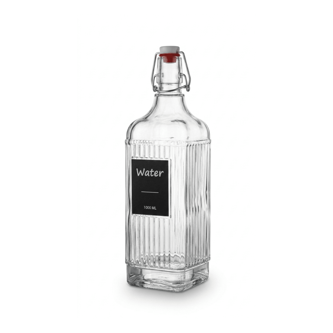 زجاجة زجاجية مربعة شفافة مضلعة سعة 1000 مل - زجاجة لتخزين المياه بغطاء معدني