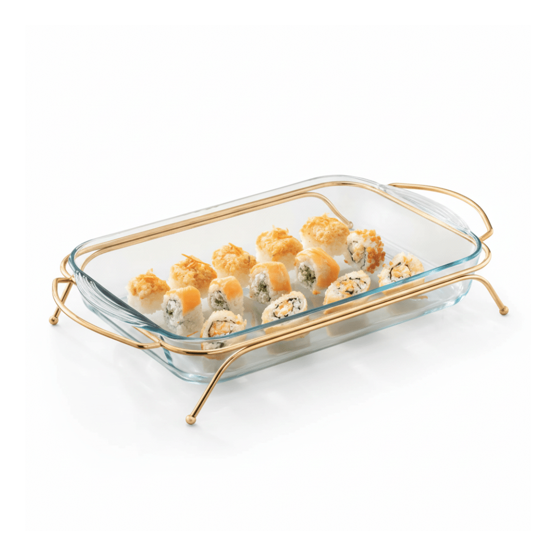 - طاجن فرن مستطيل من بوركام مع حامل معدني ذهبي