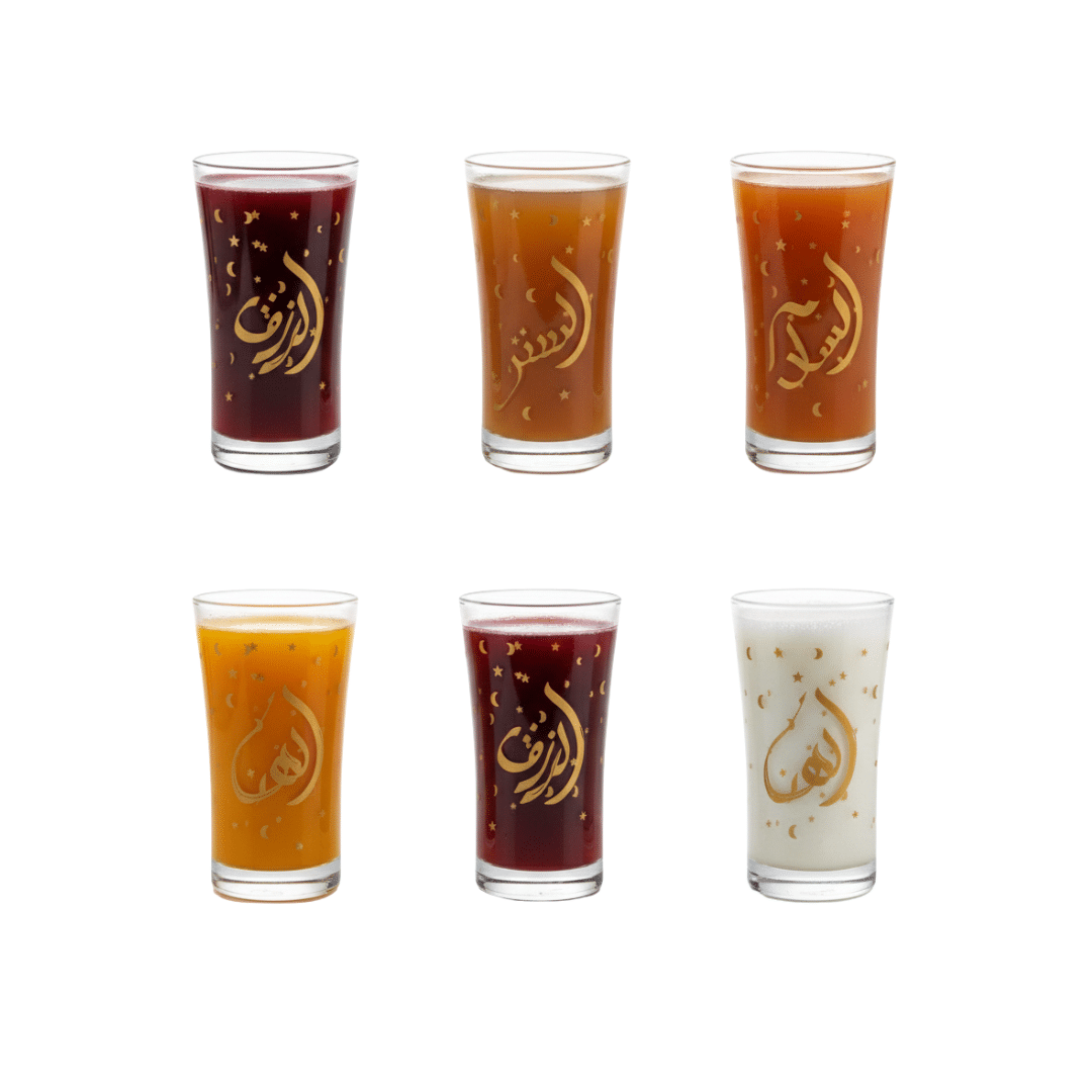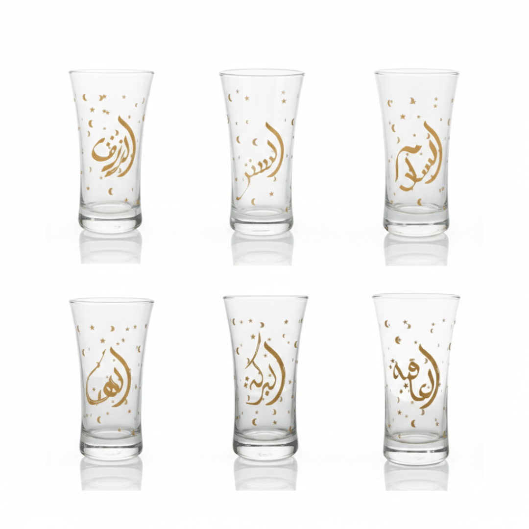 تصميم رمضاني فريد: يتميز كل كوب من الأكواب الستة في هذه المجموعة بكلمة عربية مختلفة مطلية بالذهب محاطة بزخارف القمر والنجوم السماوية، مما يجعلها إضافة مميزة لإعدادات مائدة الإفطار والسحور.