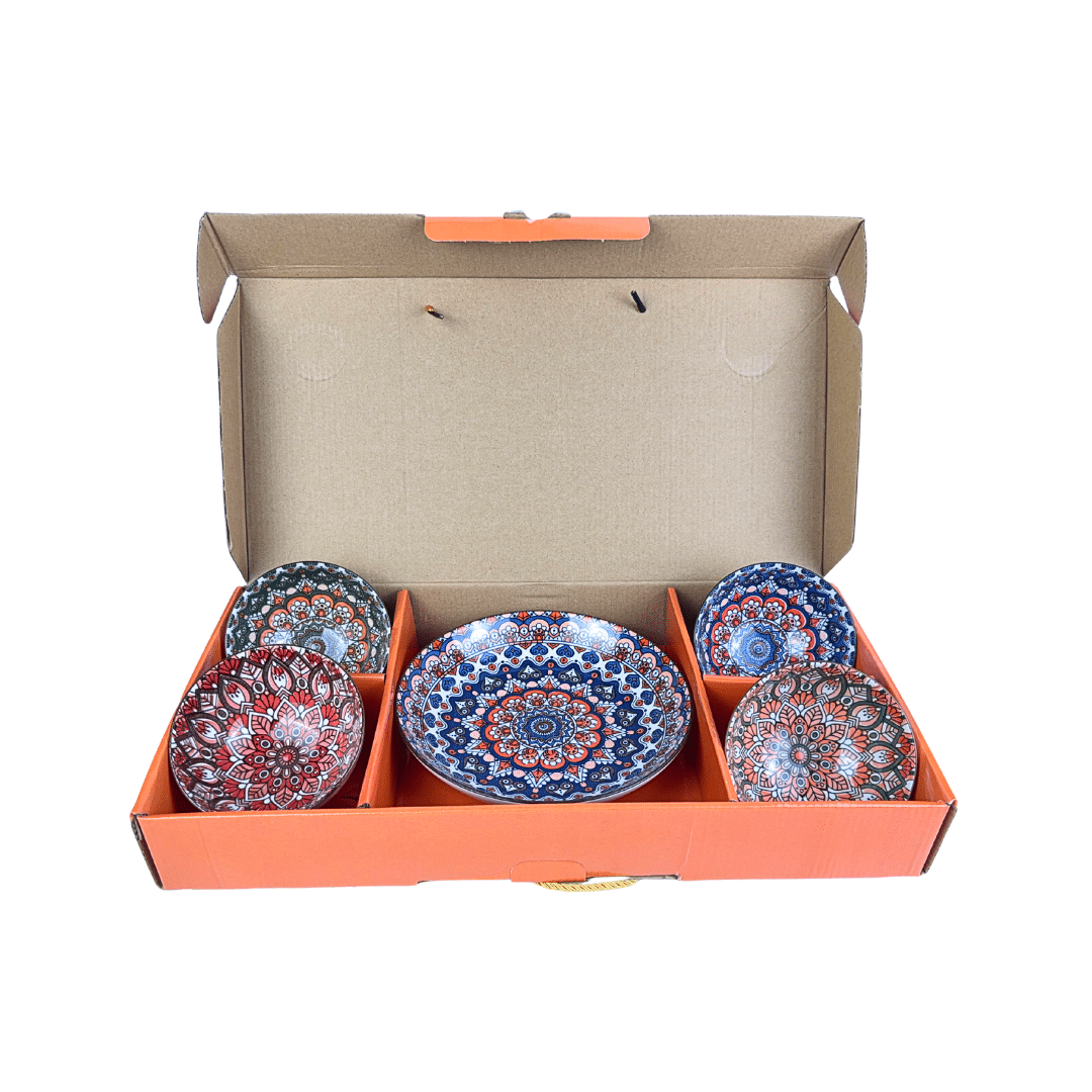 - مجموعة كاملة من 5 قطع: تتضمن أربعة (4) أوعية عميقة متعددة الاستخدامات ( قطرها 12 سم ) وطبق تقديم مركزي واحد (1) ( قطرها 21 سم )، مثالية للمقبلات أو المقبلات أو إعدادات الأماكن الفردية.