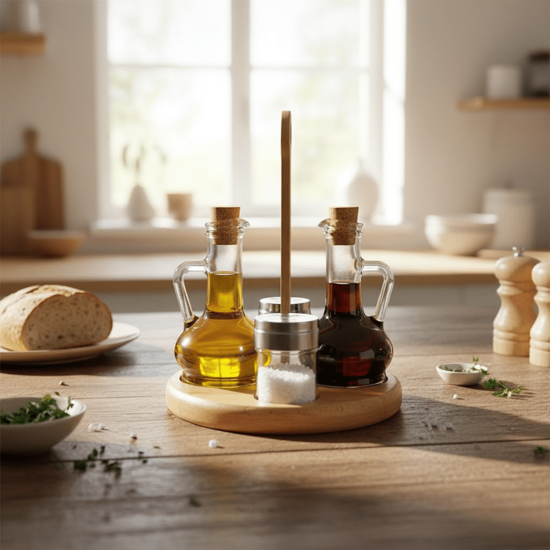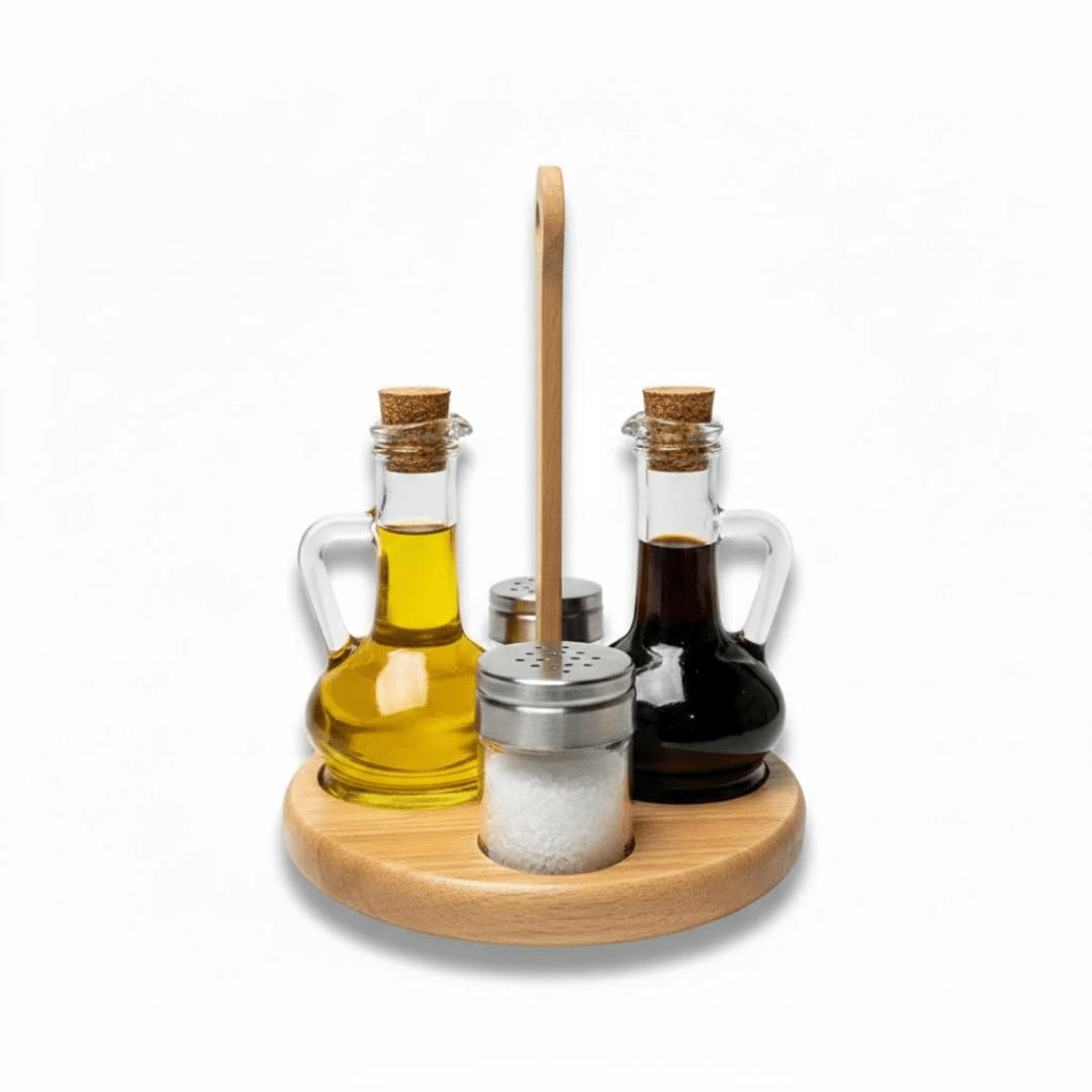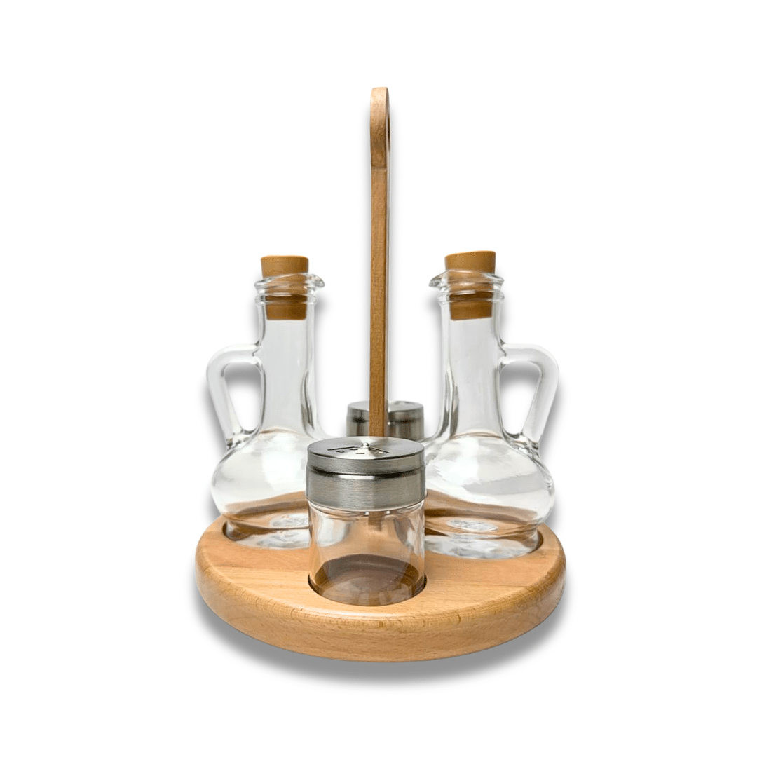 - المجموعة الكاملة: تتضمن زجاجة زيت، وزجاجة خل، وهزازة ملح، وهزازة فلفل، وحامل خشبي.