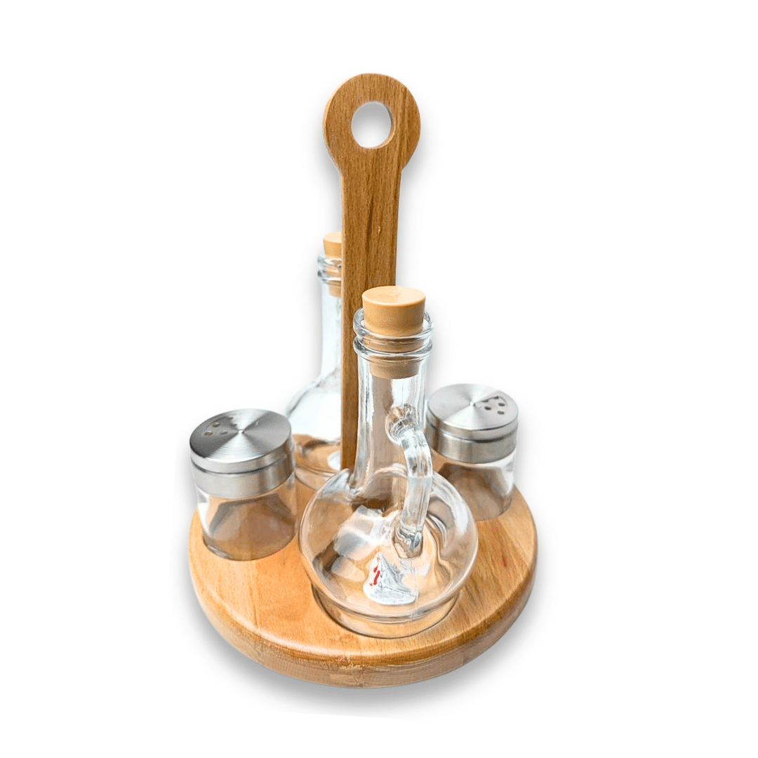طقم زيت وخل وملح وفلفل من بشايشتي مع حامل خشبي