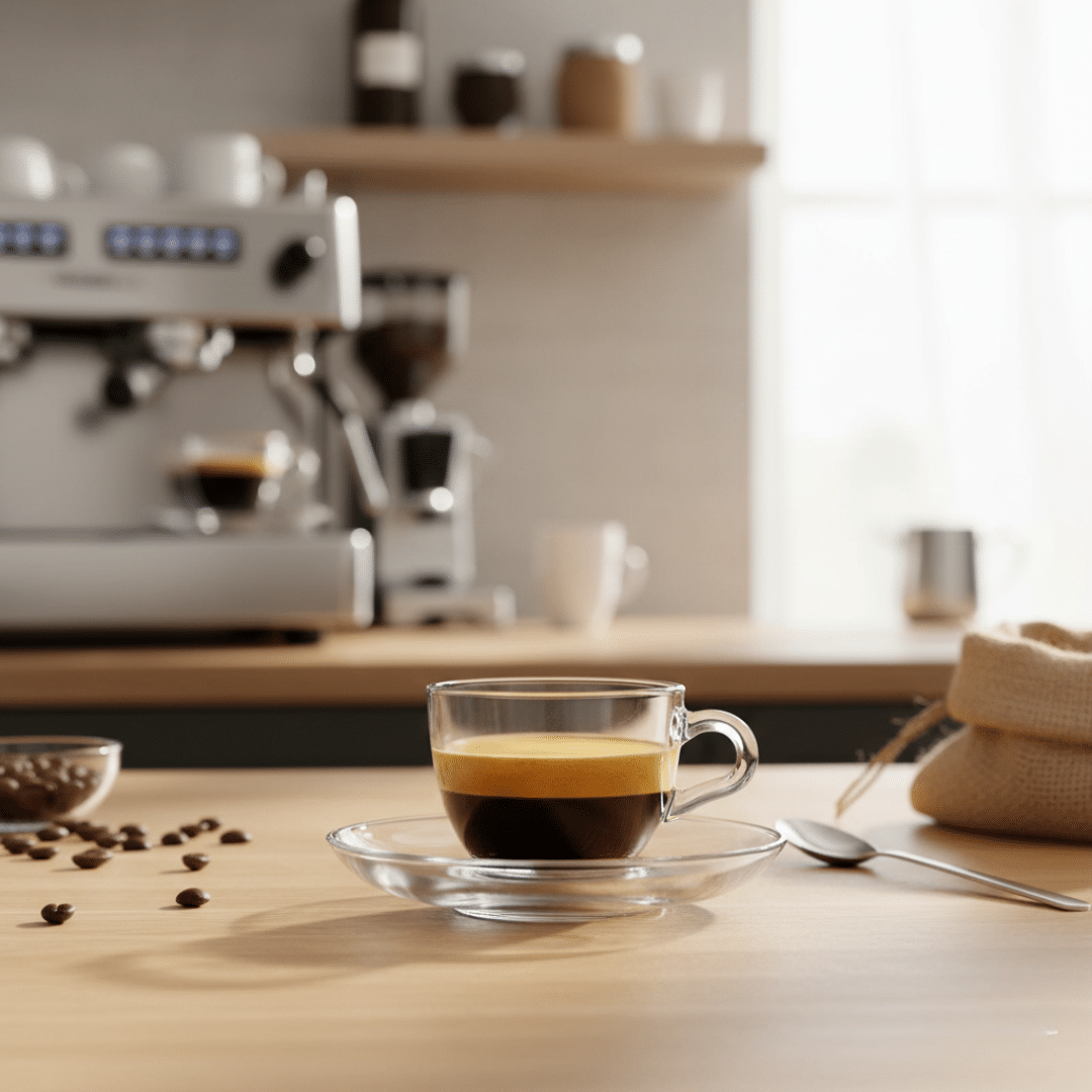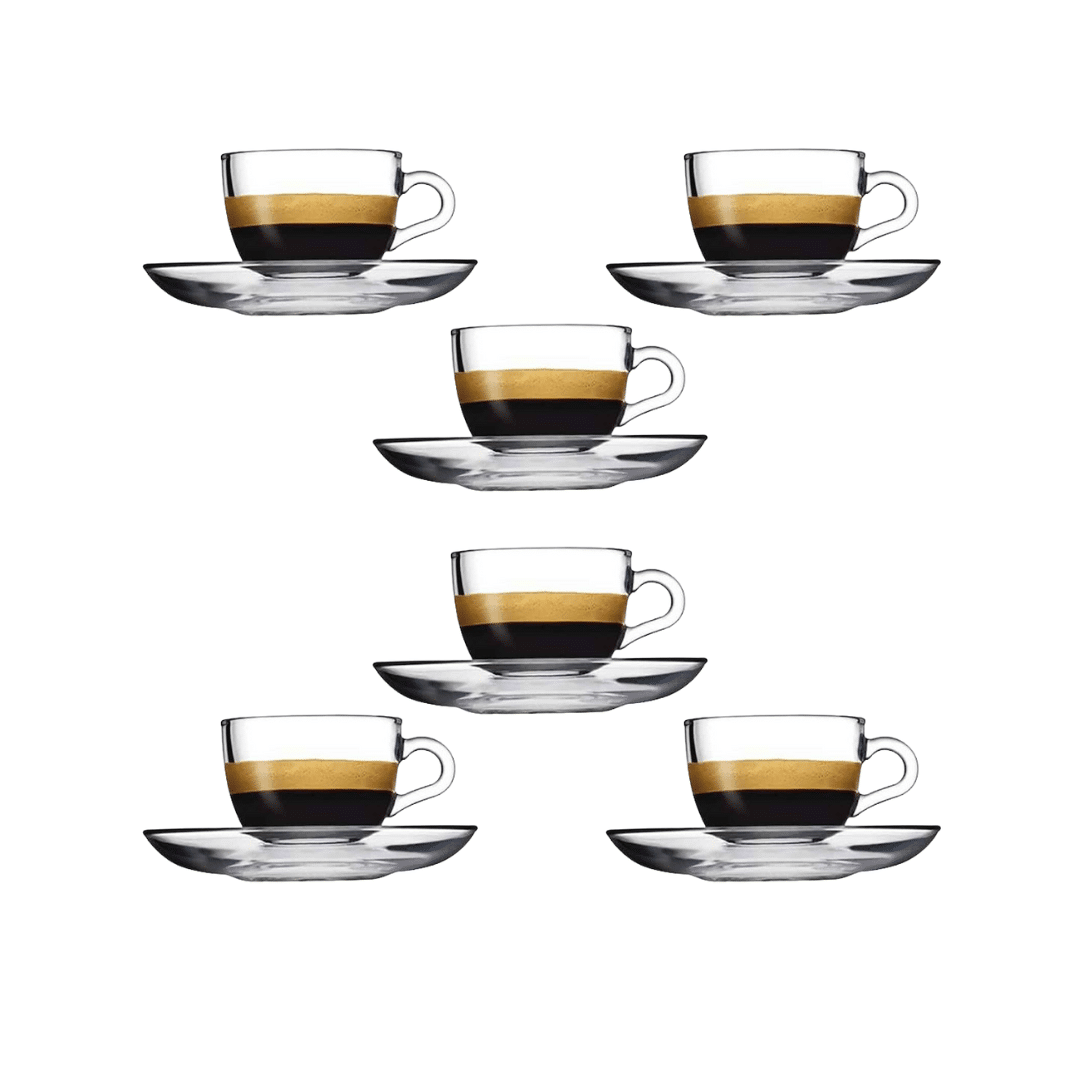 طقم قهوة كامل مكون من 12 قطعة: يتضمن هذا الطقم الشامل 6 أكواب زجاجية صغيرة للإسبريسو و6 صحون متطابقة، مما يوفر خدمة كاملة لروتينك الصباحي أو لاستضافة الضيوف.