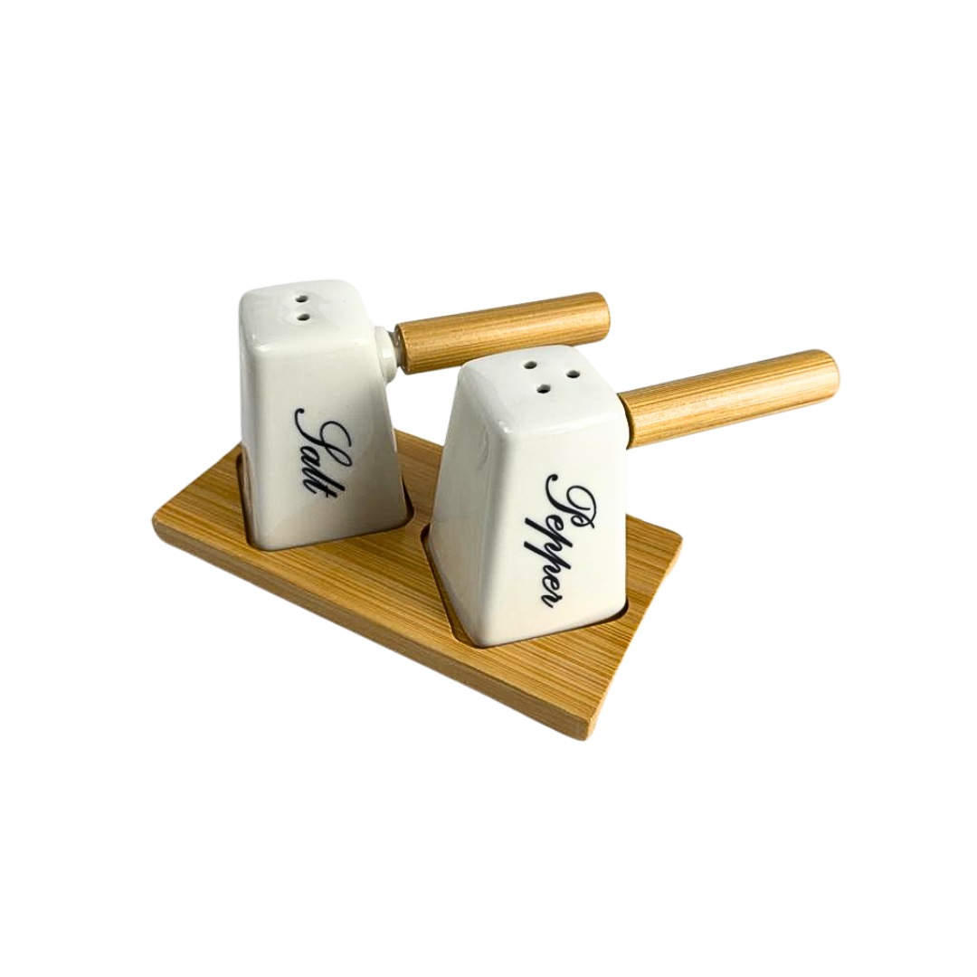 - طقم ملح وفلفل من البورسلين مع قاعدة من الخيزران