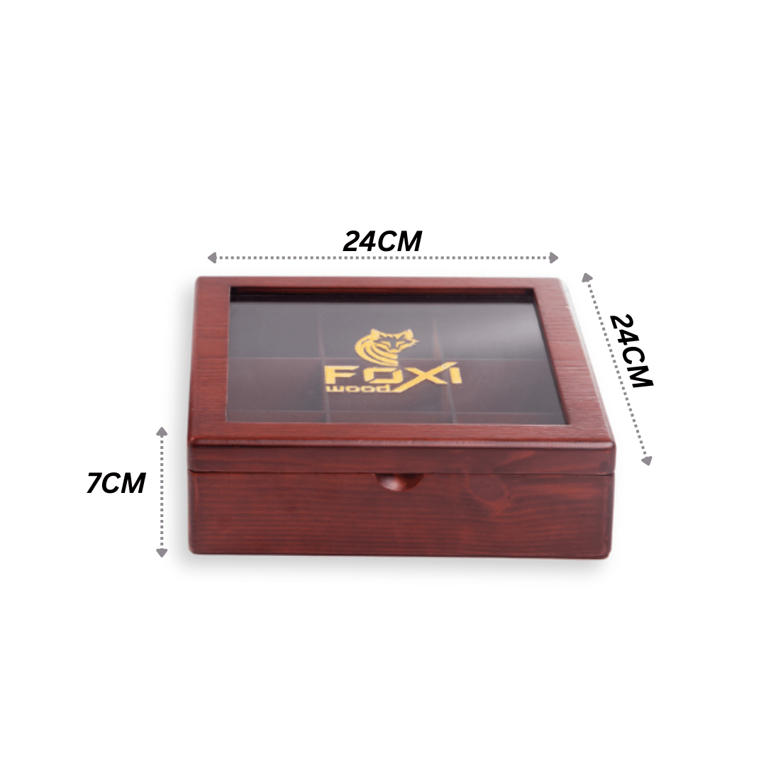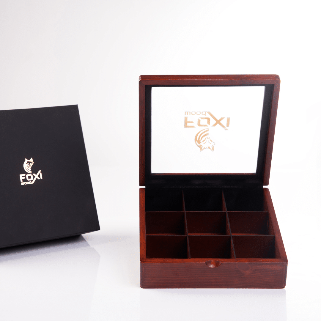 علبة شاي خشبية فاخرة من فوكسي وود – 9 فتحات – بني محمر