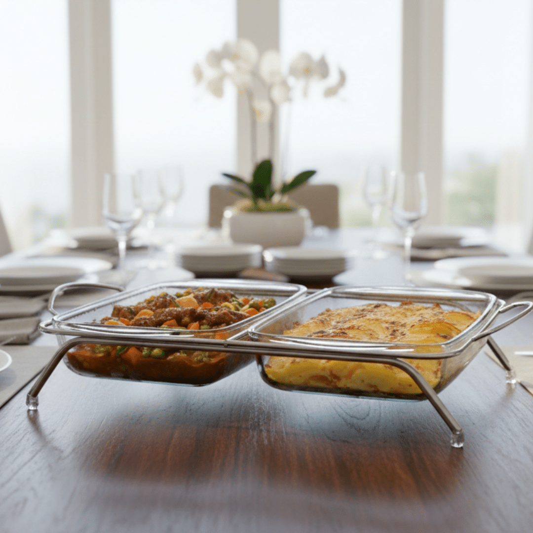 DOUBLE RECTANGLE DESIGN: Includes two matching rectangular glass casseroles, ideal for serving multiple dishes side by side.