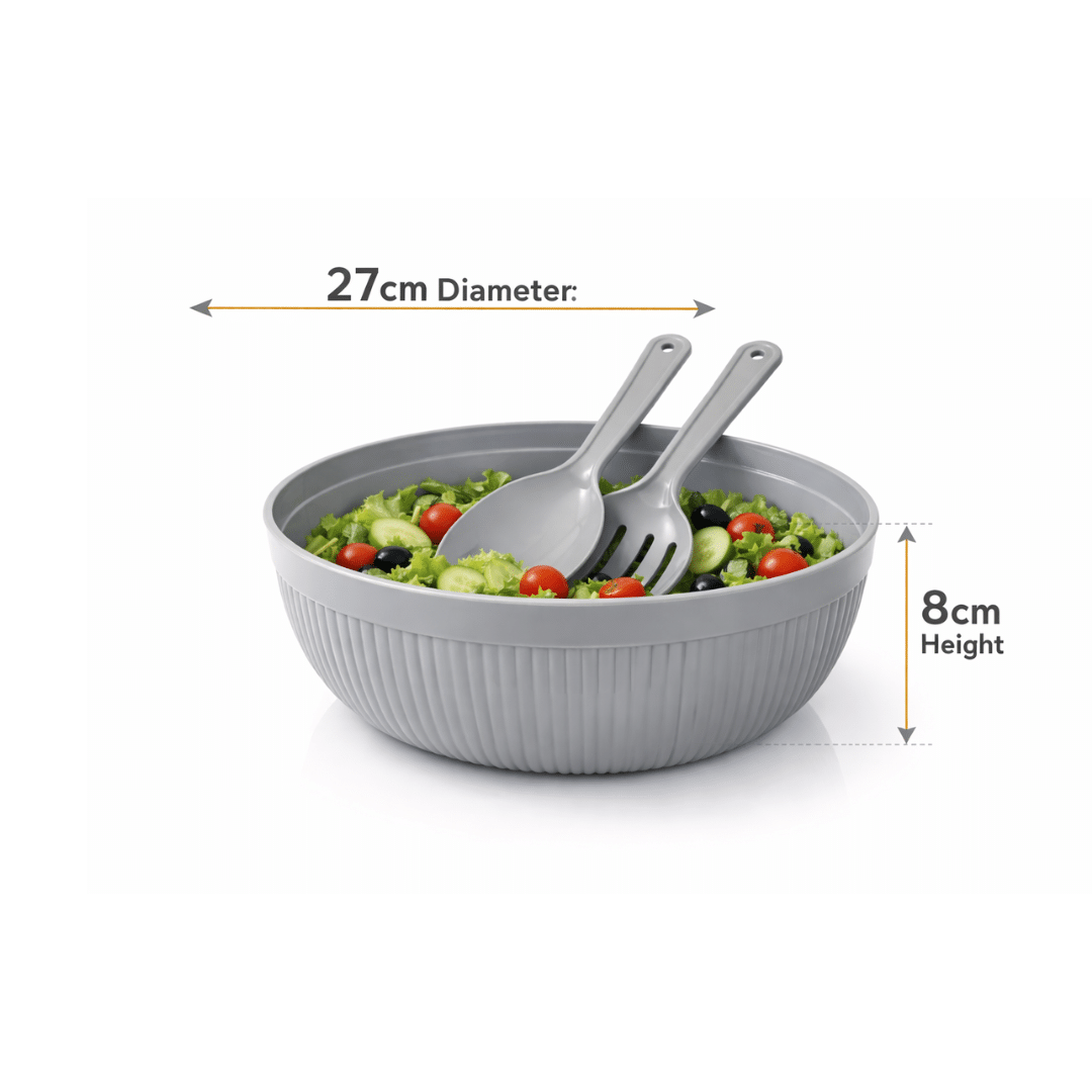 Serve fresh and delicious meals with the Dunya Chef Salad Bowl Set. Designed with a large 27 cm diameter and durable lightweight plastic construction, this bowl is perfect for salads, fruits, pasta, and more. The set includes matching serving spoon and fork for convenient mixing and serving. Its modern ribbed design adds style to any table, while the easy-to-clean material makes it ideal for everyday use, gatherings, and parties.