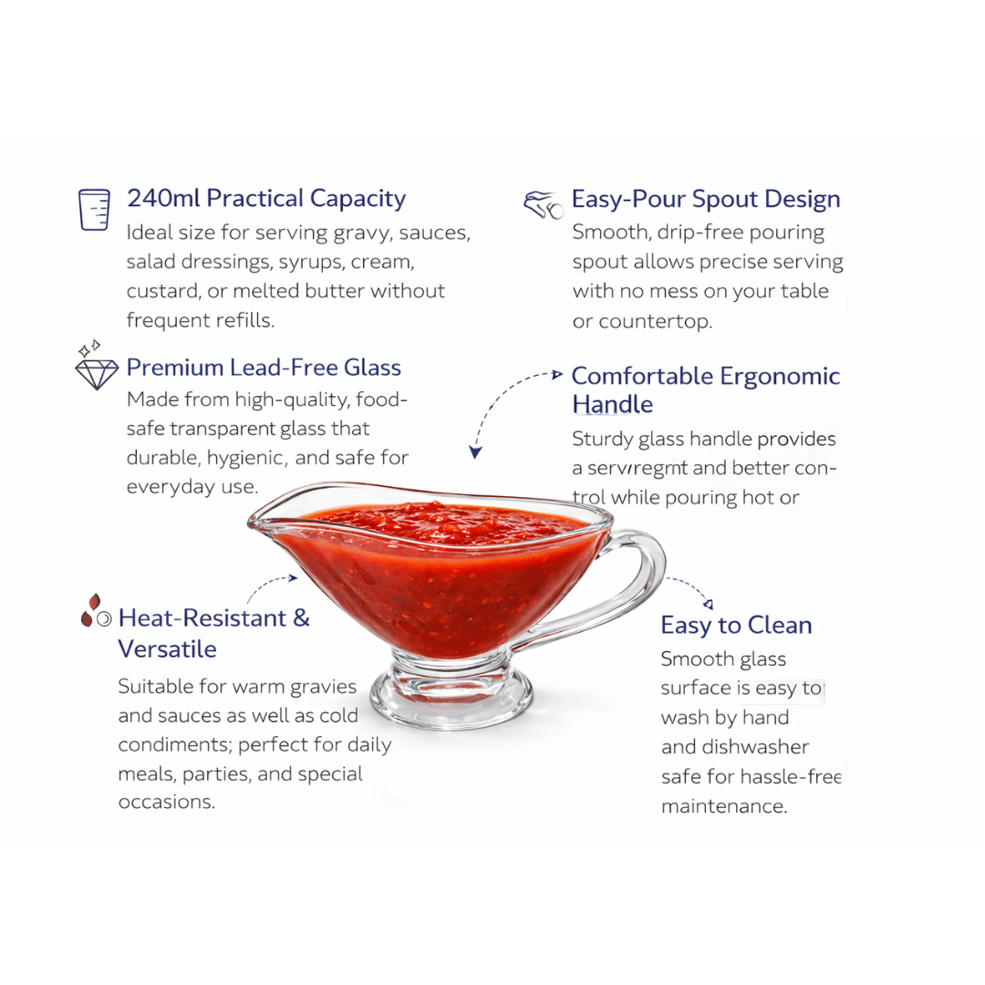 240ml Practical Capacity – Ideal size for serving gravy, sauces, salad dressings, syrups, cream, custard, or melted butter without frequent refills.