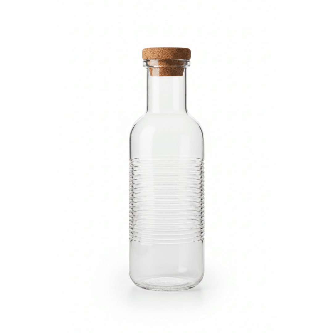 Glass Water Bottle 1 Liter with Natural Cork Lid – Reusable Clear Ribbed Glass Drinking Bottle, Leak-Resistant