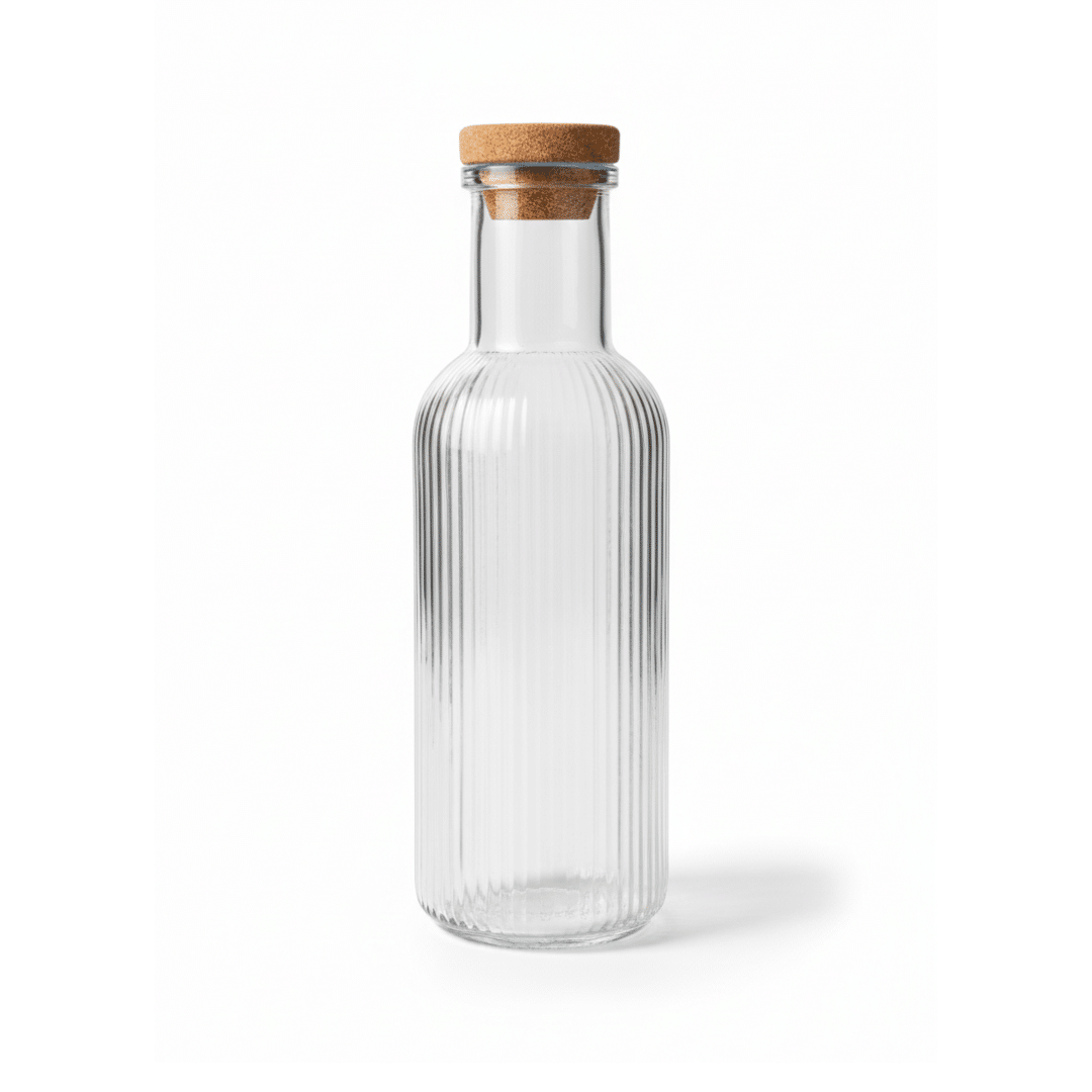 Glass Water Bottle 1 Liter with Natural Cork Lid – Reusable Clear Vertical Ribbed Glass Drinking Bottle, Leak-Resistant