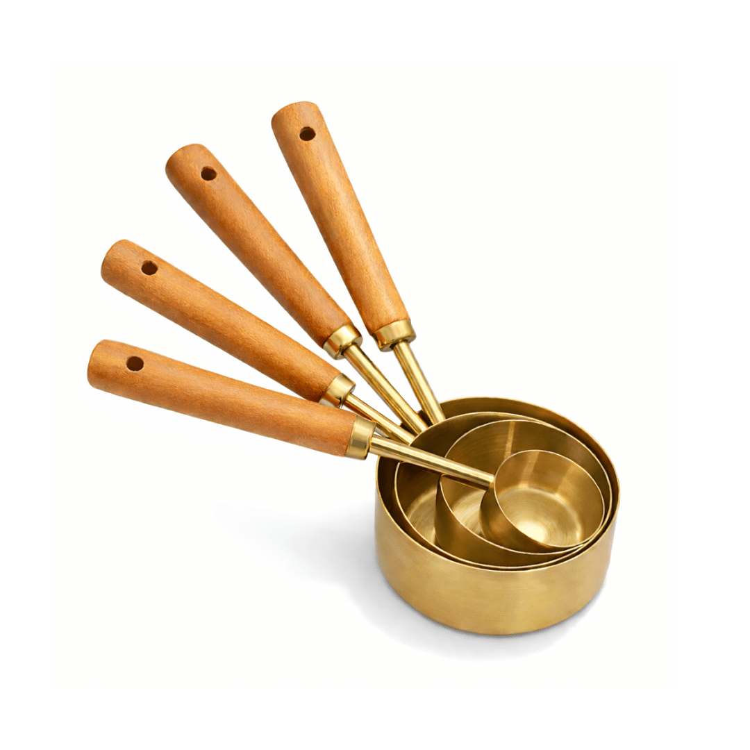 Upgrade your kitchen essentials with this premium measuring cups set, crafted from high-quality brass and finished with natural beech wood handles. Designed for both functionality and style, these cups provide accurate measurements for cooking and baking. The nesting design keeps your kitchen organized, while the sturdy construction ensures durability for everyday use. With multiple sizes included, this set is perfect for preparing recipes with ease and precision.