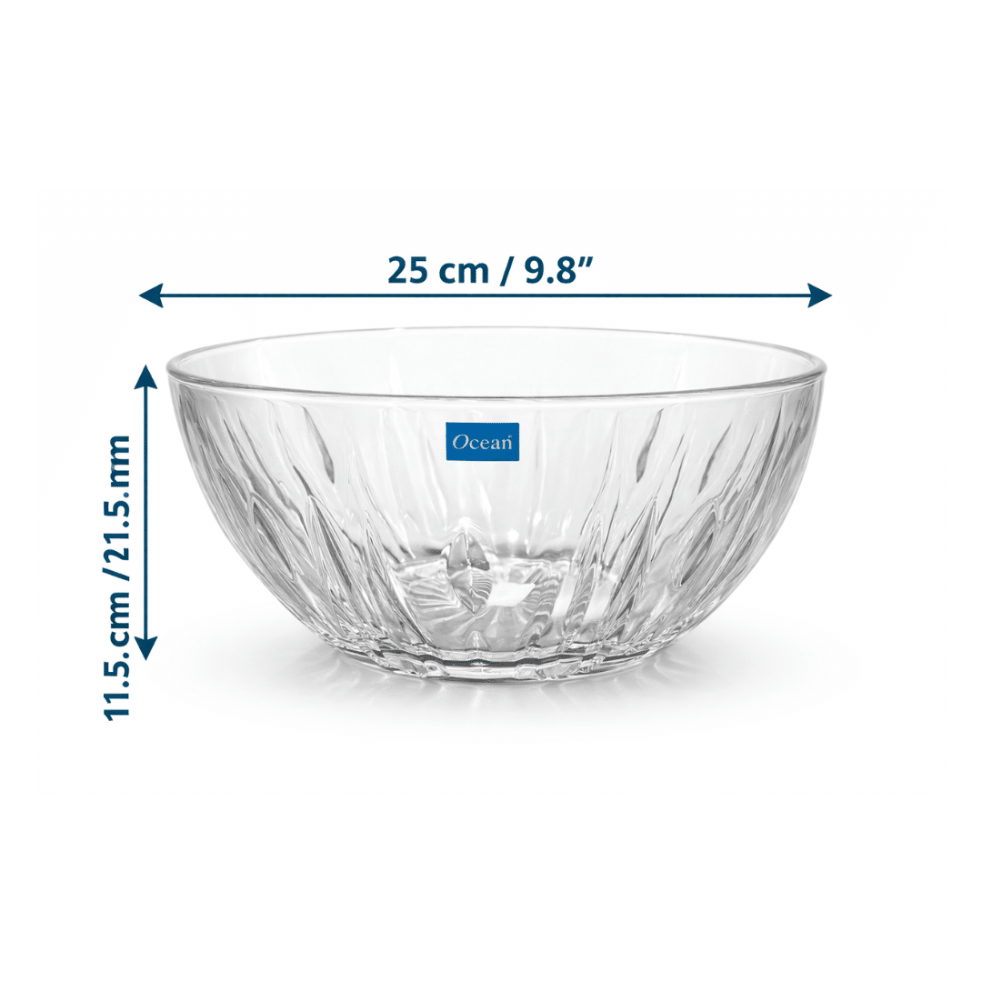 Serve and present your dishes in style with the Ocean Reya Glass Salad Bowl. With a generous 2500 ml capacity and 25 cm diameter, this bowl is perfect for salads, fruits, pasta, and more. Made from high-quality clear glass, it offers durability and a premium look that complements any table setting. Its elegant textured design enhances presentation, making it ideal for both everyday use and special occasions.