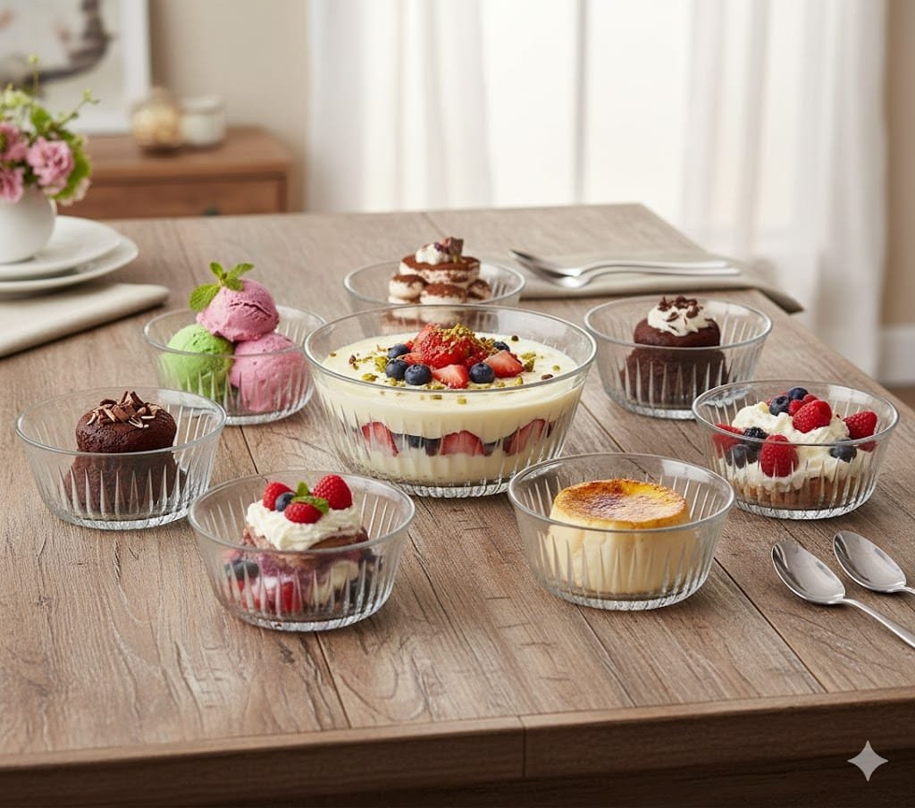 Pasabahce Frezya Round Glass Dessert Bowl Set of 7Pcs 1 Large Bowl(2650ml-24cm)+6 Small Bowls(330ml-12.5cm) Turkey Made