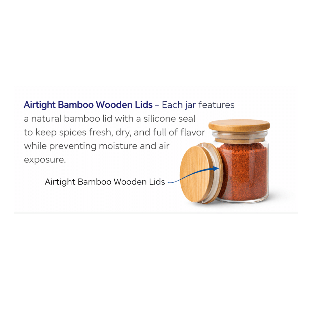Airtight Bamboo Wooden Lids – Each jar features a natural bamboo lid with a silicone seal to keep spices fresh, dry, and full of flavor while preventing moisture and air exposure.